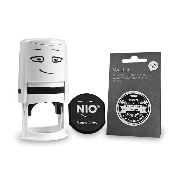 NIO® Stamp with Voucher and Fancy Gray Ink Pad, Self-Inking, 1.56" Diameter