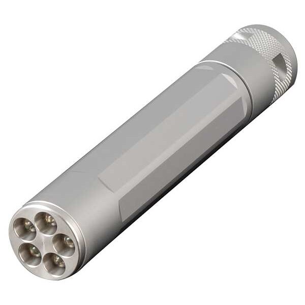 Mini Flashlight, Battery Chemistry Lithium, Battery Size CR123, Includes Batteries Yes, Number of Batteries 2, Rechargeable No, Body Color Silver, Body Material Aluminum, Lighting Technology LED, Weight with Batteries 3.52 oz., Includes Charger No, Beam Color Black, Beam Focus Fixed, Drop Rating 1 m, Hazardous Location Specification Not Rated, IP Rating IPX4, Special Operating Modes Ultraviolet