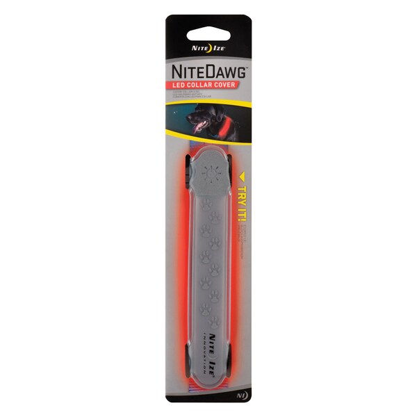 The Nite Dawg LED collar cover is the answer to every night-loving dog owner's problem: losing sight of their best buddy after sundown. Durable weather resistant and lightweight this super low-profile (not much thicker than a bandage) flexible LED illuminated strip fits comfortably over almost any dog's collar and closes securely with two micro hook-and-loop tabs. Its bright light-transmitting polymer core is illuminated by a super efficient red LED bulb with two mode settings - flash and steady glow and is housed in a high-quality thermal plastic urethane exterior. Visible up to 1000 feet in the dark and powered by a long-life easily replaceable battery (included) the Night Dawg LED Collar Cover is available in two colors with decorative paw prints that provide passive reflectivity for visibility even when not illuminated. * Simply the best way to keep your dog's presence clear and obvious from dusk till dawn! *