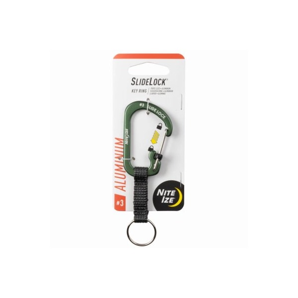 Olive Slide Lock KeyRing. This colorful locking aluminum carabiner and key ring are joined by a short nylon webbing strap to keep your keys separate yet connected. The carabiner features a SlideLock mechanism that locks the gate so it can be confidently secured to a belt loop backpack or purse strap.