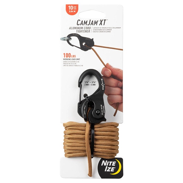 Rope Tightener, Color Black, Compatible Rope Diameter 3/16 in, Includes 10 ft Coyote Paracord, Material Aluminum, Overall Length 2 1/2 in, Product Type Rope Tightener, Working Load Limit 100 lb, Overall Width 1 5/16 in