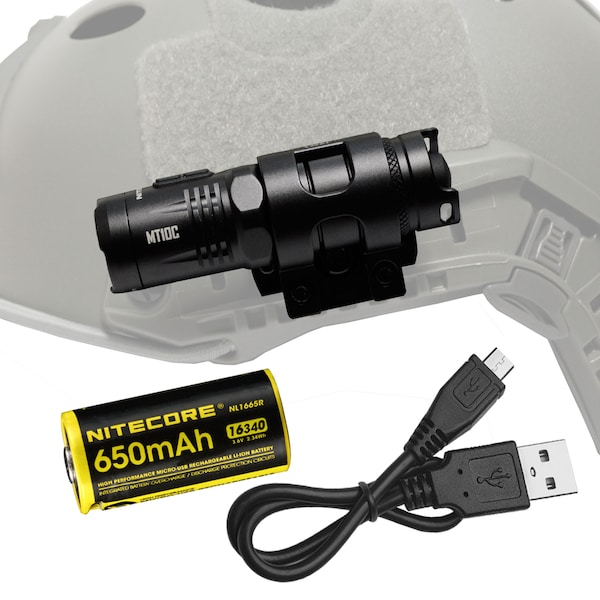 Get ready for your next mission with the Nitecore MT10C and LMA1 rotary helmet mount tactical flashlight! The LMA1 was designed to mount any 1" diameter body flashlight to Ops-Core ARC Rails. Low profile yet bright, The MT10C lights up your surroundings with 920 lumens and 207 yards of throw in a only 2.01 oz compact body. The mount rotates the flashlight 360° in eight locking positions to provide lighting in any direction. The red light preserves night vision and is great for navigation. The beacon mode can be used for signaling in emergency situations.