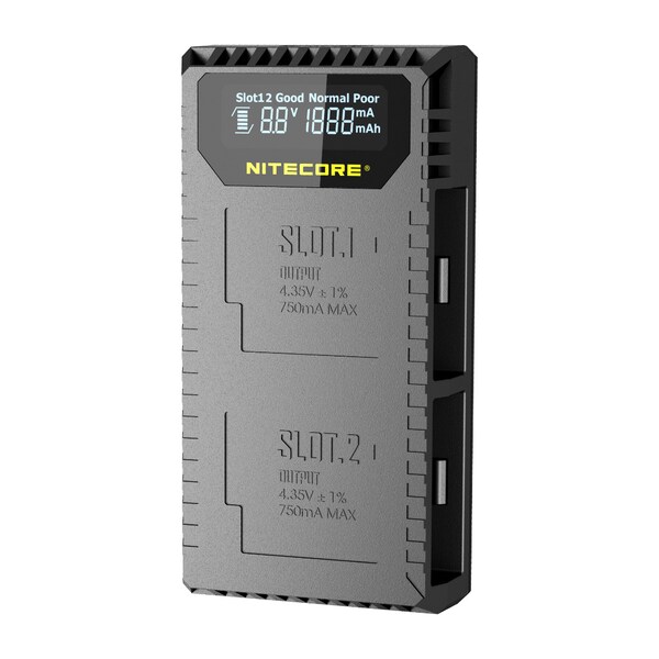 Introducing the NITECORE UCN1 dual-slot USB travel charger designed to recharge Canon EOS LP-E6, LP-E6N, and LP-E8 batteries. This lightweight and compact battery charger features a built-in USB charging input that stows away in a designated secure trough to save space and prevent damage. The UCN1 has a dual port design to simultaneously charge LP-E6 or LP-E6N batteries on one side and LP-E8 on the reverse.