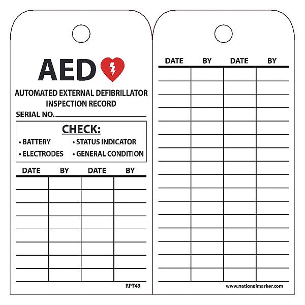 AED Automated External Defibrillator Inspection Record Tag, Pk25