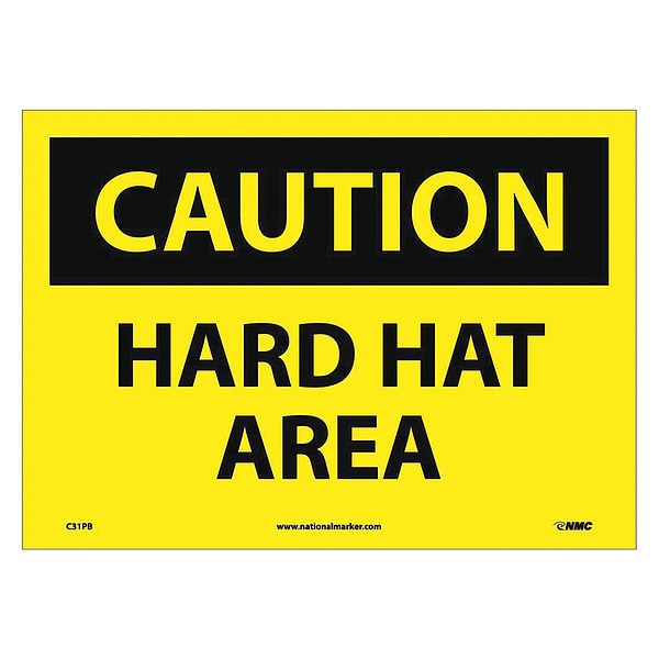 Caution Hard Hat Area Sign, 10 in Height, 14 in Width, Pressure Sensitive Vinyl