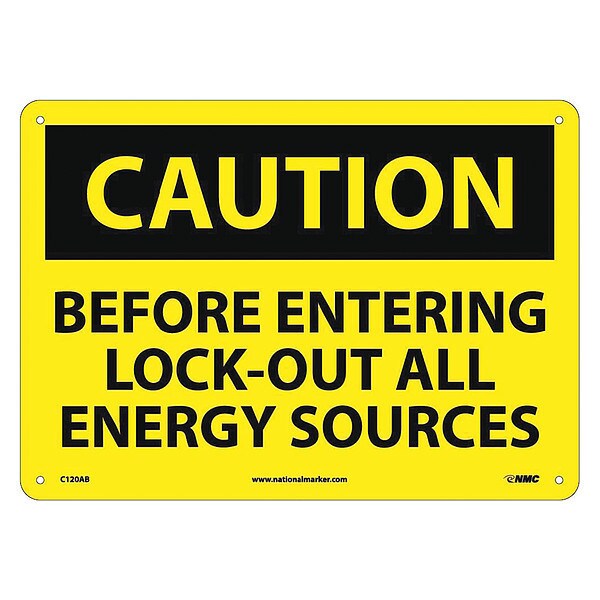 Caution Lock Out All Sources Sign, 10 in Height, 14 in Width, Aluminum