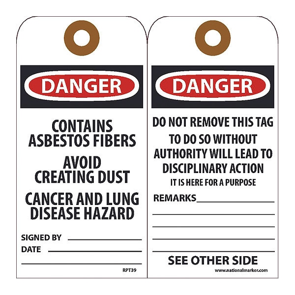 Contains Asbestos Fibers Avoid Creating Dust Cancer And Lung Disease Hazard Signed By___ Date___ (Side 1), Do Not Remove This Tag To Do So Without Authority Will Mean Possible Discharge It Is Here For A Purpose See Other Side (Side 2)