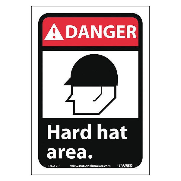 Danger Hard Hat Area Sign, 10 in Height, 7 in Width, Pressure Sensitive Vinyl