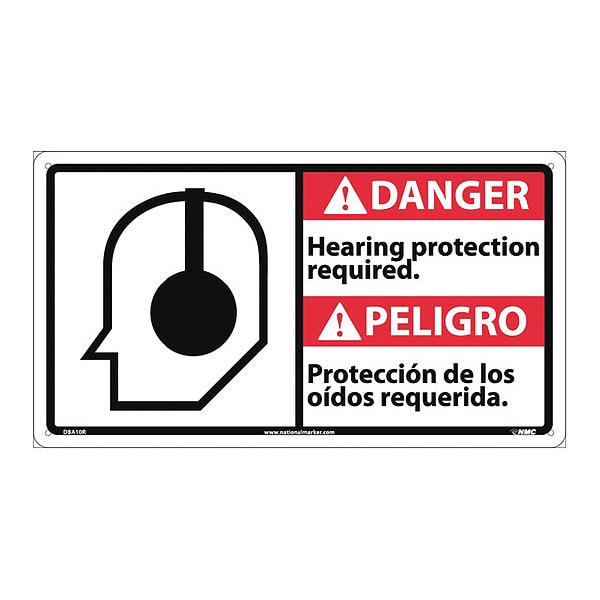 Danger Hearing Protection Required Sign, 10 in Height, 18 in Width, Rigid Plastic