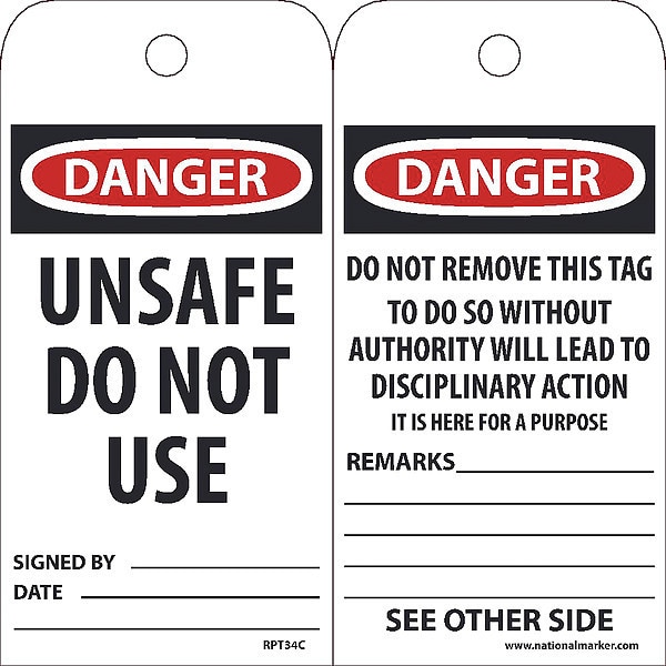 Back: Do Not Remove This Tag - To Do So Without Authority Will Mean Disciplinary Action! It Is Here For A Purpose; Front: Unsafe Do Not Use