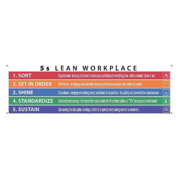 Lean Workplace Banner, 5S, 5S Lean Workplace, 10 ft H x, 3 ft W, Polyethylene