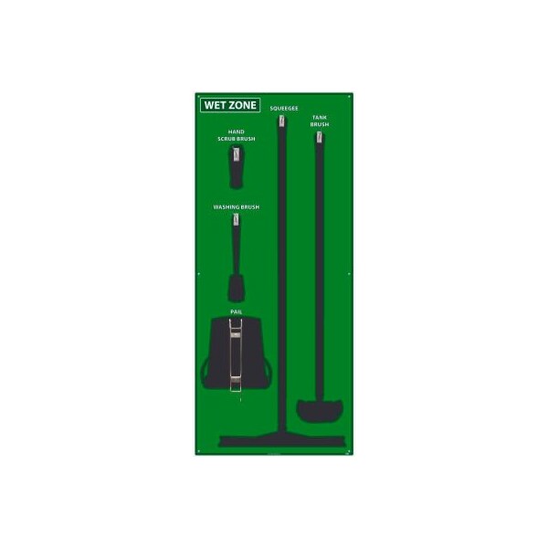 National marker wet zone shadow board, green/black,68 x 30, pro series acrylic - sb120fg many manufacturing and food processing facilities are implementing 5s shadow boards to help reduce cost and down time by keeping cleaning supplies (and other tools), in a central location, neatly stored, and always accessible. features: designed for food processing and washdown environments. includes shadow board and hardware for mounting tools designed for vikan brand tools (sold separately): tank brush, 24' single blade squeegee, long handle scrub brush, large hand brush, and 3 gallon bucket. pro series acrylic with subsurface ink that will not chip, peel or deteriorate. temperature range of -30 to 190