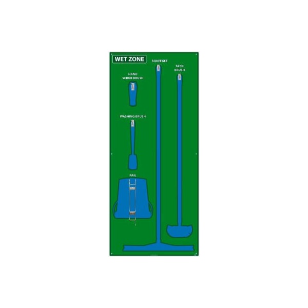 National marker wet zone shadow board, green/blue,68 x 30, pro series acrylic - sb119fg many manufacturing and food processing facilities are implementing 5s shadow boards to help reduce cost and down time by keeping cleaning supplies (and other tools), in a central location, neatly stored, and always accessible. features: designed for food processing and washdown environments. includes shadow board and hardware for mounting tools designed for vikan brand tools (sold separately): tank brush, 24' single blade squeegee, long handle scrub brush, large hand brush, and 3 gallon bucket. pro series acrylic with subsurface ink that will not chip, peel or deteriorate. temperature range of -30 to 190