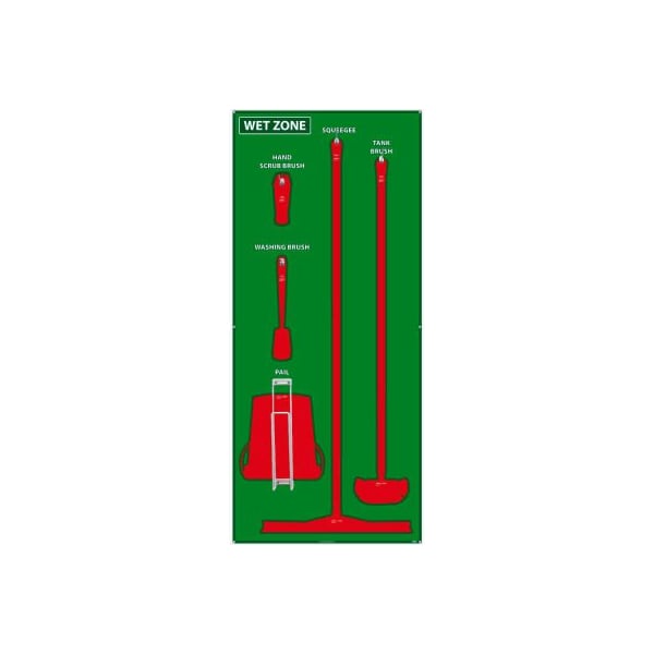 National marker wet zone shadow board, green/red,68 x 30, acp, aluminum composite panel - sb118acp many manufacturing and food processing facilities are implementing 5s shadow boards to help reduce cost and down time by keeping cleaning supplies (and other tools), in a central location, neatly stored, and always accessible. features: ideal for basic maintenance and organizational use includes shadow board and hardware for mounting tools designed for vikan brand tools (sold separately): tank brush, 24' single blade squeegee, long handle scrub brush, large hand brush, and 3 gallon bucket. lightweight, dual-layered aluminum with plastic core protected by sign muscle liquid laminate temperature range of -60 to 180