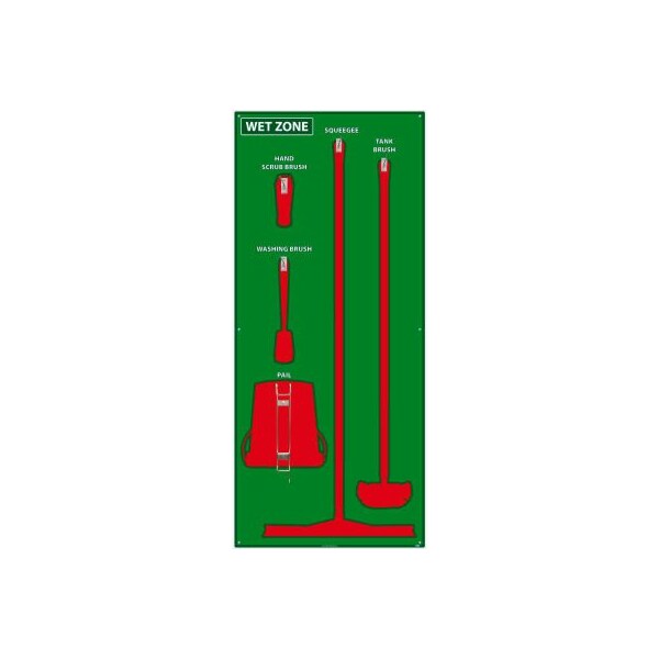 National marker wet zone shadow board, green/red,68 x 30, pro series acrylic - sb118fg many manufacturing and food processing facilities are implementing 5s shadow boards to help reduce cost and down time by keeping cleaning supplies (and other tools), in a central location, neatly stored, and always accessible. features: designed for food processing and washdown environments. includes shadow board and hardware for mounting tools designed for vikan brand tools (sold separately): tank brush, 24' single blade squeegee, long handle scrub brush, large hand brush, and 3 gallon bucket. pro series acrylic with subsurface ink that will not chip, peel or deteriorate. temperature range of -30 to 190