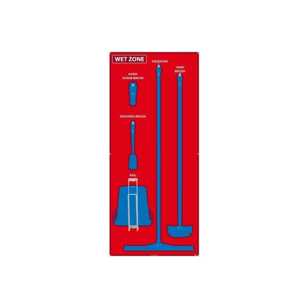 National marker wet zone shadow board, red/blue,68 x 30, aluminum - sb111al many manufacturing and food processing facilities are implementing 5s shadow boards to help reduce cost and down time by keeping cleaning supplies (and other tools), in a central location, neatly stored, and always accessible. features: great for industrial, manufacturing applications. includes shadow board and hardware for mounting tools designed for vikan brand tools (sold separately): tank brush, 24' single blade squeegee, long handle scrub brush, large hand brush, and 3 gallon bucket. durable, industrial grade aluminum. protected by sign muscle liquid laminate temperature range of -40 to 250