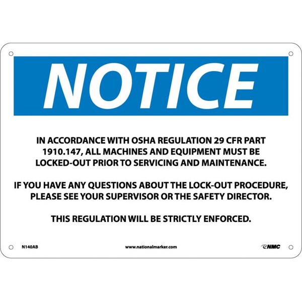 Notice Osha Regulation Lockout Sign, 10 in Height, 14 in Width, Aluminum (Discontinued)