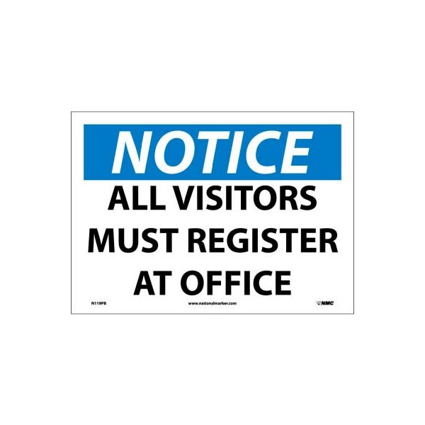 Safety signs, vinyl 10"h x 14"w, notice all visitors must register safety signs brightly colored, easy to read signs helps comply with osha standards. Notice signs convey important safety information. text on sign: notice - all visitors must register at the office