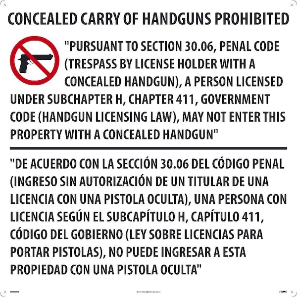 Texas Concealed Handgun Law Sign, M460ACP
