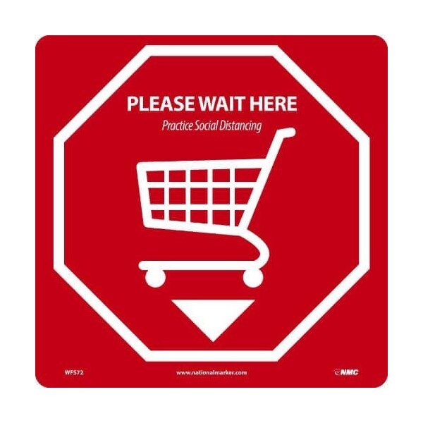 pNational Marker 12 H x 12 W in pressure sensitive vinyl 0045 walk on floor sign PLEASE WAIT HERE PRACTICE SOCIAL DISTANCINGp