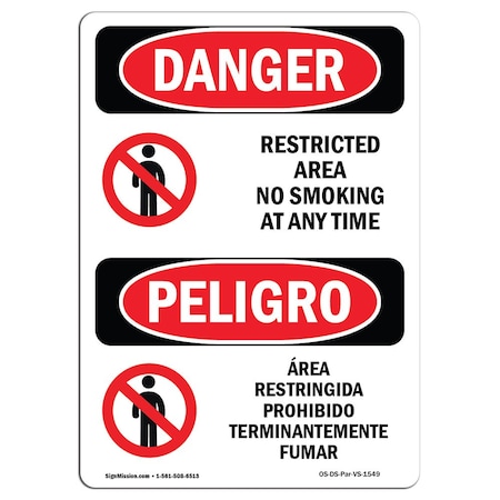 OSHA Sign, Restricted Area No Smoking Any Time, 14in X 10in Rigid Plastic, 10" W, 14" L, Spanish