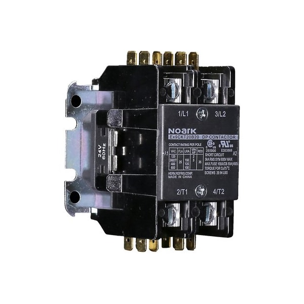 Definite-purpose (DP) contactor - NOARK (Ex9CKT series) - 2-poles (2P; 2NO) - 30A (FLA) rated current - 24Vac (50/60Hz) coil - Lug connection with slot screw for line and load sides + Dual FASTON Quick Connect spade connectors (2 connectors per pole) - 3HP (240Vac; single-phase) rated power - Direct On Line (DOL) / FVNR (Full-Voltage Non-Rv.) - replaces Ex9CK30B20B7 - equivalent to 1314473