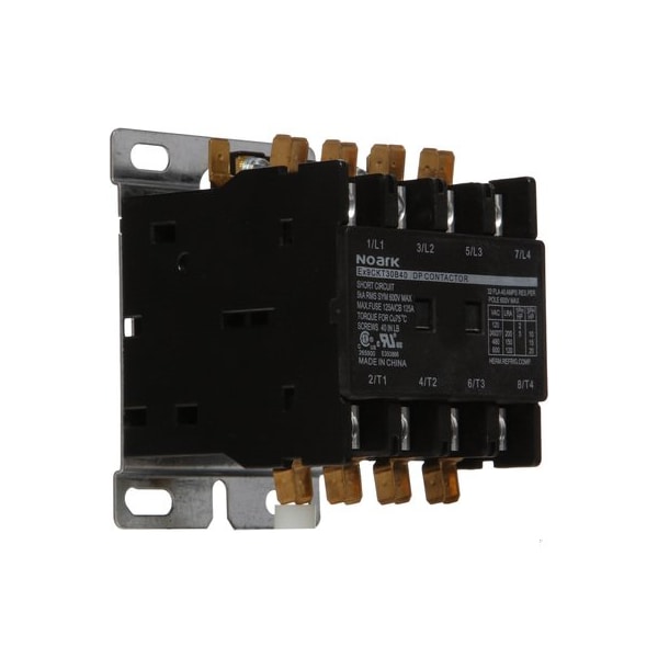 Definite-purpose (DP) contactor - NOARK (Ex9CKT series) - 4-poles (4P; 4NO) - 40A (FLA) rated current - 120Vac (50/60Hz) coil - Lug connection with slot screw for line and load sides + Dual FASTON Quick Connect spade connectors (2 connectors per pole) - 20HP (600Vac; 3-phase) rated power - Direct On Line (DOL) / FVNR (Full-Voltage Non-Rv.) - equivalent to 1314367