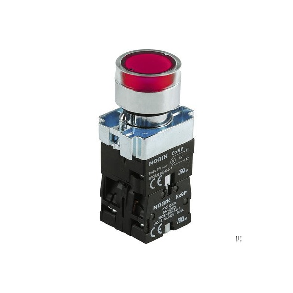 Illuminated pushbutton/push-button/PB with LED + guard - full-voltage input - NOARK (Ex9PB series) - Red - Round bezel / 22mm (7/8") round flat / flush - Spring-return (impulse/momentary) - 2NC contacts - Metallic alloy body / Chrome-plated bezel - Supply voltage 24Vac / 24Vdc - IP40 - equivalent to 1200285