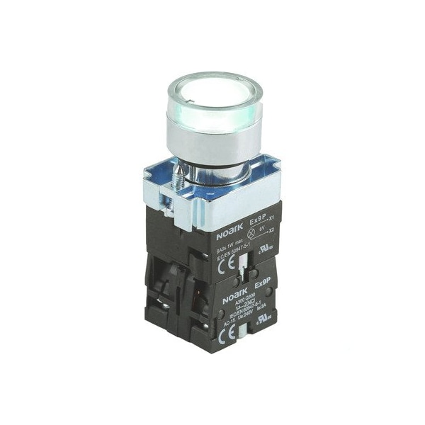 Illuminated pushbutton/push-button/PB with LED + guard - full-voltage input - NOARK (Ex9PB series) - White - Round bezel / 22mm (7/8") round flat / flush - Spring-return (impulse/momentary) - 1NO contact - Metallic alloy body / Chrome-plated bezel - Supply voltage 24Vac / 24Vdc - IP40 - equivalent to 1200163