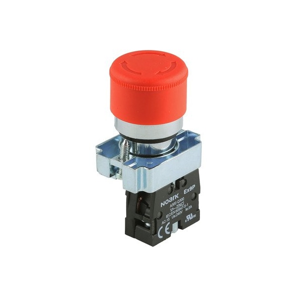 Pushbutton/push-button/PB - NOARK (Ex9PB series) - Red button - Round bezel / diam. 40mm mushroom head - Push-on / Twisted-OFF / Twist-to-release - 1NO+1NC contacts - Metallic alloy body / Chrome-plated bezel - IP40 - equivalent to 1200457