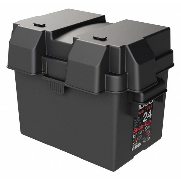 Battery Box, Fits Battery Size Group Group 24, Battery Box Material Polypropylene, Battery Box Color Black, Inside Length 10 1/2 in, Inside Width 7 13/64 in, Inside Height 9 39/64 in, Outside Length 14 in, Outside Width 10 in, Outside Height 10 45/64 in, Features Snap Top Closure, Standards US Coast Guard