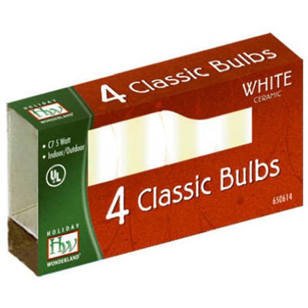 Features Holiday Wonderland C7, 120V White Ceramic Candelabra Base Replacement Bulbs. 4 Pack. Dimension - 1 x 3 x 5 in. Item Weight - 0.08 lbs.