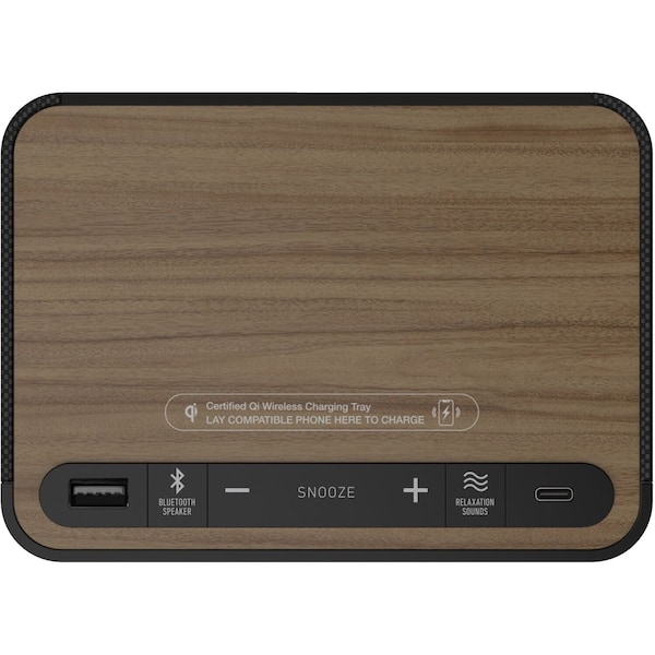 Hotel alarm clock and white noise machine with QI wireless charging, dual USB outlets and a bluetooth speaker.