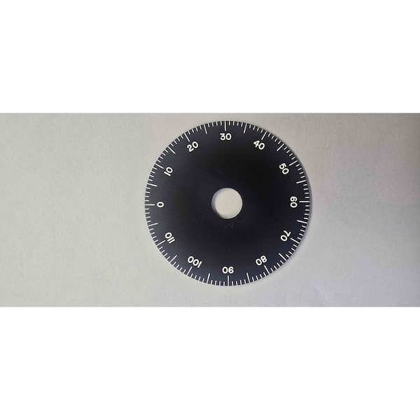 Engraved Disc Dials - Counter Clockwise. Material: 2024-T4 Aluminum Black anodized. Order Number HCA-A1-38. Outside Diameter 4.00000. Graduations 360. Steps In Degrees 1. Range 0-360. Direction of Engraving Counter Clockwise