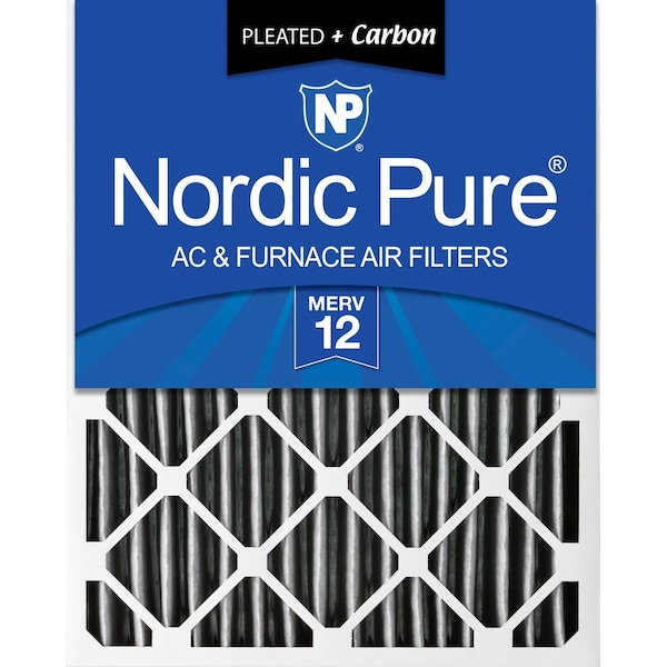 Nordic Pure 20x24x4 MERV 12 Pleated Plus Carbon air filters are made of a dual material where the MERV rated material has been fused together with a carbon layer. This results in less flow restriction and 33% more surface area for cleaner smelling air. It will help eliminate unwanted odors as well as trap most airborne dust and particulate matter for fresh, clean air. Odorous gases and vapors VOC are attracted to and held by the activated carbon material while maintaining excellent air flow properties. Each time air passes through a Nordic Pure carbon pleated furnace filter, lint, household dust, pollen, dust mites, pet dander, smoke particles, virus carriers, bacteria, mold spores and other contaminants are removed. All Nordic Pure + carbon pleated air filters are manufactured using a heavy duty, moisture resistant beverage board frame. There is a metal mesh support grid bonded to the pleats for extra support. Our AC filter media prevents the growth of bacteria or mold, resulting in a much healthier living environment. MERV 12 furnace air conditioner filters are comparable to HVAC filters with the rating of MPR 1500-1900. Particles in indoor air are measured in microns; for scale, a human hair is about 70 microns wide. Each Nordic Pure 4in MERV 12 air filter wilmore...