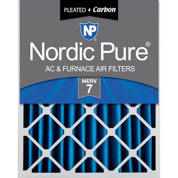 Nordic Pure 24x24x4 MERV 7 Plus Carbon air filters are made of electrostatically charged synthetic materials with an added flat panel infused with activated charcoal that will attract and capture most airborne particulates in your home. It will help eliminate unwanted odors as well as trap most airborne dust and particulate matter for fresh, clean air. Odorous gases and vapors VOC are attracted to and held by the activated carbon material while maintaining excellent air flow properties. Each time air passes through a Nordic Pure carbon pleated furnace filter, lint, household dust, pollen, dust mites, pet dander, bacteria, mold spores and other contaminants are removed. All Nordic Pure + carbon pleated air filters are manufactured using a heavy duty, moisture resistant beverage board frame. There is a metal mesh support grid bonded to the pleats for extra support. Our AC filter media prevents the growth of bacteria or mold, resulting in a much healthier living environment. MERV 7 furnace air conditioner filters are comparable to HVAC filters with the rating of MPR 600. Particles in indoor air are measured in microns; for scale, a human hair is about 70 microns wide. Each Nordic Pure 4in MERV 7 air filter captures airborne particles as small as 3.0 to 10.0 microns. more...