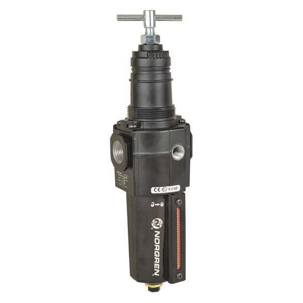 Filter-Regulator, Filter Bowl Material Metal, Air Inlet Size 1/2 in, Air Inlet Type PTF, Maximum Flow Rate 212 cfm, Filter Rating 40 micron, Maximum Operating Pressure 250 psi, Drain Type Automatic, Pressure Gauge Included No, Body Material Aluminum, Overall Width 3 1/8 in, Adjustment Mechanism Knob, Adjustment Mechanism Material Polypropylene and TPV, Air Outlet Size 1/2 in, Air Outlet Type PTF, Differential Pressure Indicator Included No, Drain Included Yes, Filter Bowl Capacity 7 oz