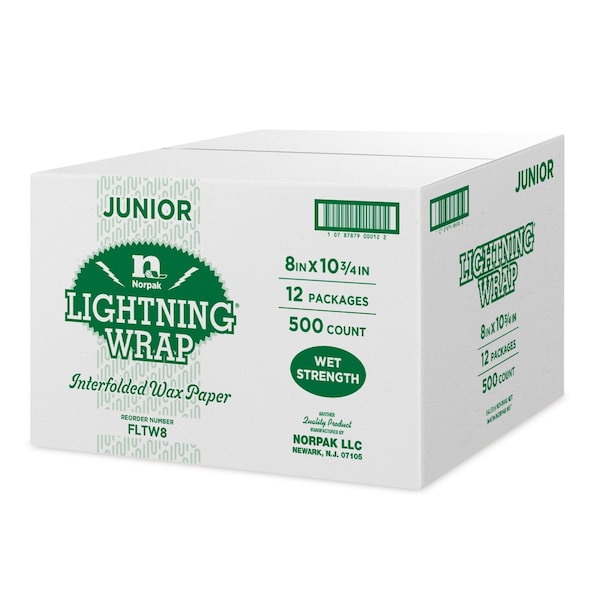 The Lightning Wrap measures 8 inches by 10.75 inches and is designed for secure wrapping and protection applications. It is manufactured by Norpak and features durable construction suitable for various uses requiring reliable containment. Available in a pack of 6000, the wrap’s size ensures versatility for multiple tasks, providing effective coverage and support in industrial or commercial settings.