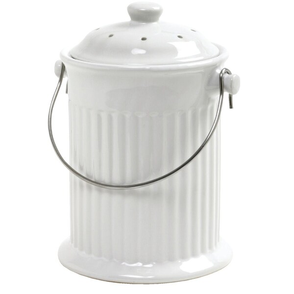 Store peelings egg shells coffee grounds greens clippings and fruit and vegetable scraps for transfer to garden compost. Sturdy stainless steel handle and charcoal-free odor preventing filter in lid. 10.5 tall. 4 quart capacity. White.