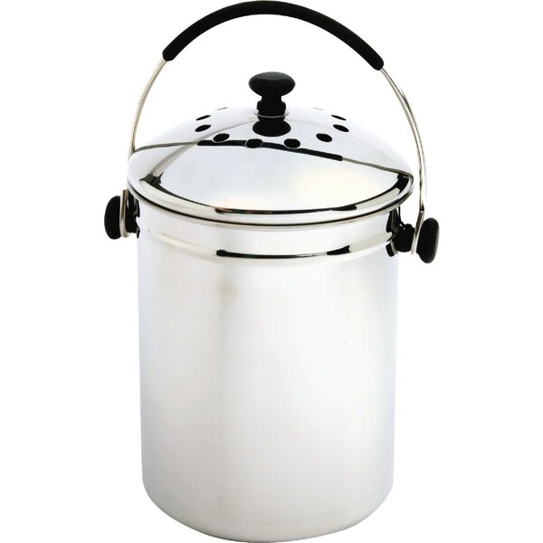 1 gallon stainless steel compost keeper. Store peelings egg shells coffee grounds and vegetable scraps for transfer to your garden composter. Tight fitting lid holds charcoal filter set for odor-free use up to 6 months. Sturdy stainless steel handle. Easy-to-clean. Designed to sit on kitchen countertop. Dimensions: 11 H. x 8.25 round. Stainless steel.