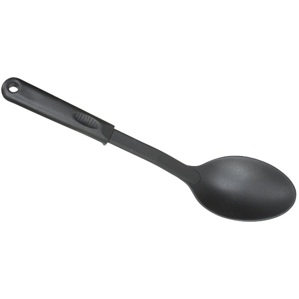 12 In. black nylon spoon makes stirring lifting and transferring foods simple. Dishwasher safe heat-resistant to 410 deg. F. nonskid easy-grip handles.