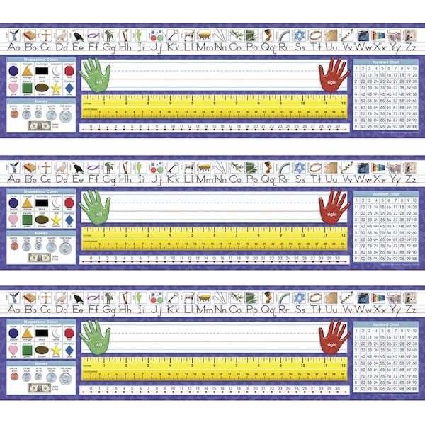 Christian Primary Traditional Manuscript Desk Plates include photo alphabet line featuring Biblical images and symbols, name plate with left and right handprints, 12" (30 cm) ruler, number line (0 to 30), shapes and colors, U.S. currency, and hundred chart. Each pack includes 36 desk plates. Sold as 3 packs for a total of 108 desk plates.