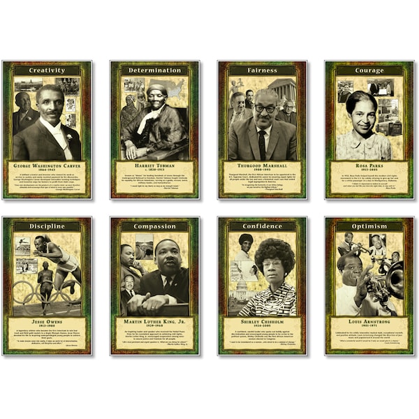 Familiarize students with some of the most powerful character traits demonstrated by successful leaders throughout history. Eight 11" x 17" (27.9 x 43.2 cm) posters feature well-known African American historical figures, their leadership qualities, and the influence of these characteristics on their achievements. Inspirational quotes from each individual underscore their exemplary leadership qualities. Includes 8 pieces.