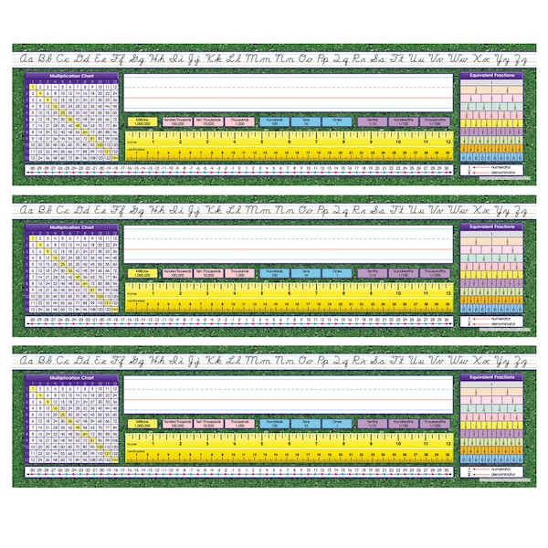 Improve learning levels with these handy desk references. Simply write in students names and tape to students desks for year-round use. Intermediate desk plates include alphabet line, name plate, place value, 12'' (30 cm) ruler, number line (-30 to 30), 12 x 12 multiplication chart, temperature chart, and equivalent fractions. Measures 19 x 5" (48.3 X 12.7 cm). Includes 36 per package. Sold as 3 packs, 108 desk plates total.