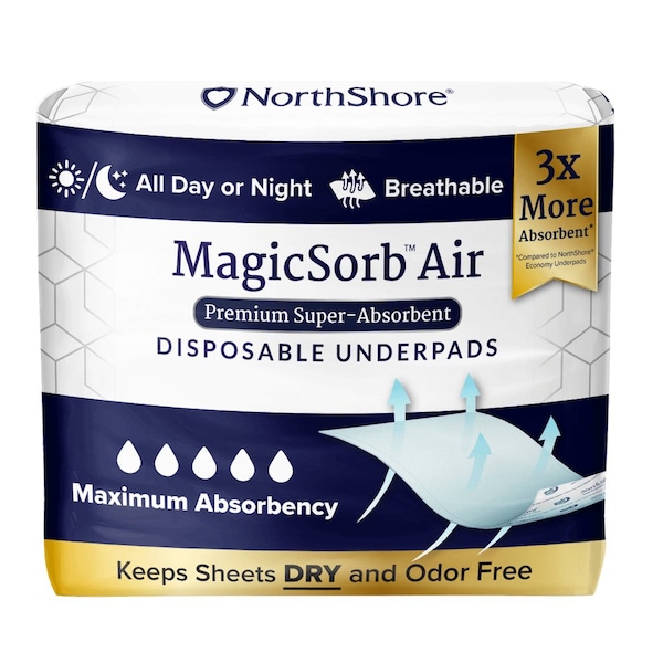 Waterproof yet cool to sleep on, MagicSorb Air underpads are air permeable allowing them to contribute to reduced heat buildup and improved skin dryness. MagicSorb Air underpads are 2X MORE absorbent than other underpads, lessening the need for multiple pad use.