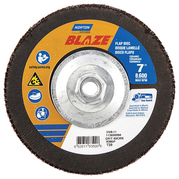 Flap Disc, Abrasive Type Coated, Abrasive Material Ceramic, Grade Coarse, Backing Plate Material Fiberglass, Connector Size 5/8 In.-11, Connector Type Threaded Hole, Density Rating Standard, Flap Disc Type Type 29, Overall Diameter 7 in, Series Blaze R980P, Backing Material Polyester, Backing Weight Y, Grit 60, Maximum Operating Speed 8,600 RPM, Color Orange, Features Performance Coated, Resistance Properties Fray