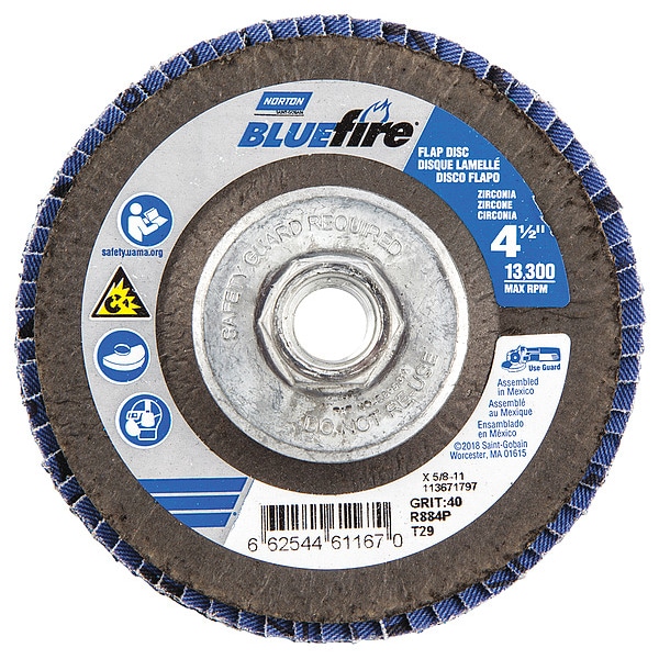 Flap Disc, Abrasive Type Coated, Abrasive Material Zirconia Alumina, Grade Extra Coarse, Backing Plate Material Fiberglass, Connector Size 5/8 In.-11, Connector Type Threaded Hole, Density Rating Standard, Flap Disc Type Type 29, Overall Diameter 4 1/2 in, Series BlueFire R884P, Backing Material Cotton, Backing Weight Y, Coating Coverage Semi-Open, Grit P40, Maximum Operating Speed 13,300 RPM, Color Blue