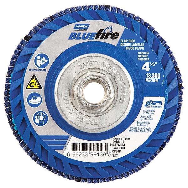 Flap Disc, Abrasive Type Coated, Abrasive Material Zirconia Alumina, Grade Coarse, Backing Plate Material Plastic, Connector Size 5/8 In.-11, Connector Type Threaded Hole, Density Rating Standard, Flap Disc Type Type 27, Overall Diameter 4 1/2 in, Series BlueFire R884P, Backing Material Cotton, Backing Weight Y, Coating Coverage Semi-Open, Grit P80, Maximum Operating Speed 13,300 RPM, Color Blue, Features Trimmable