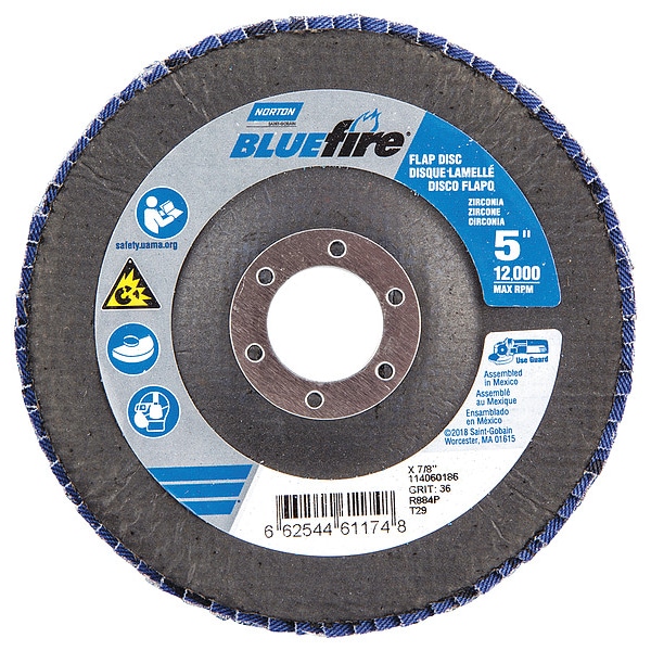 Flap Disc, Abrasive Type Coated, Abrasive Material Zirconia Alumina, Grade Extra Coarse, Backing Plate Material Fiberglass, Connector Size 7/8 in, Connector Type Unthreaded Hole, Density Rating Standard, Flap Disc Type Type 29, Overall Diameter 5 in, Series BlueFire R884P, Backing Material Cotton, Backing Weight Y, Coating Coverage Semi-Open, Grit P36, Maximum Operating Speed 12,000 RPM, Color Blue