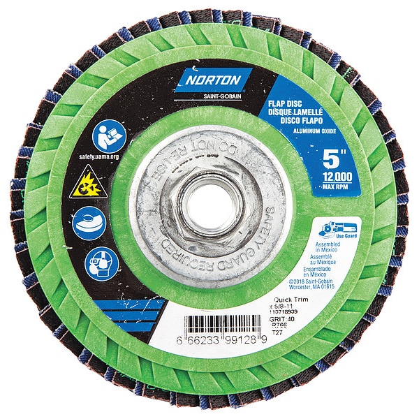 Flap Disc, Abrasive Type Coated, Abrasive Material Zirconia Alumina, Grade Extra Coarse, Backing Plate Material Plastic, Connector Size 5/8 In.-11, Connector Type Threaded Hole, Density Rating Standard, Flap Disc Type Type 27, Overall Diameter 5 in, Series Gemini R766, Backing Material Cotton, Backing Weight X, Grit P40, Maximum Operating Speed 12,000 RPM, Color Blue, Features Trimmable